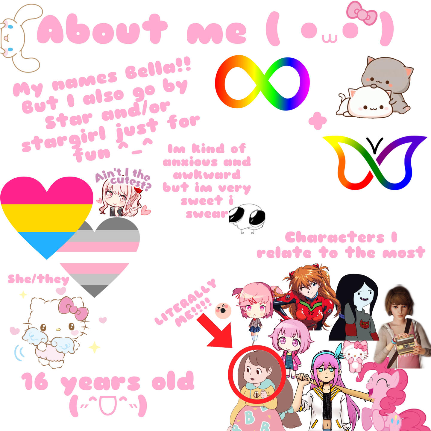 Hii :D my names bella,star, or stargirl !! I use she/they pronouns and im a demigirl (・ω・) Im also pansexual and taken!! and use some xenogenders too just for shits and giggles ٩(^◡^)۶ I am 16 years old (17 on 11/11!!!) and im an 11th grader in highschool :3 I have autism and adhd, and im just an anxious and awkward person in general, but im super friendly and love talking to new people! Don’t be scared to message me or start up a conversation!! :D